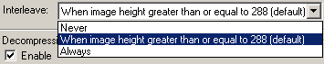 Si capturamos con una resolución vertical mayor o igual a 288 deberemos dejar seleccionada la opción "Interleave" (entrelazado) que viene por defecto, aunque también podemos seleccionar "Always" (siempre) o "Never" (nunca). ¡Ojo! No desactivar la casilla "Enable" (habilitada) en el apartado "Decompression" (descompresión) o no podremos reproducir las capturas.