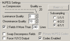 - El PICVideo MJPEG por el contrario, captura con pérdida, pero ofrece una relación compresión/calidad realmente buena. Podemos modificar la calidad de 0 (mínima) a 20 (máxima) de manera automática si nos quedamos en el menú básico, pero si entramos en las opciones avanzadas podremos elegir los niveles de calidad de luminosidad y crominancia (color) de manera individual, así como el submuestreo (Ver 1.2 YUV). Como sucedía con el códec de LEAD, deberemos dejar marcada la casilla "Codec Enabled" para no tener problemas de reproducción.