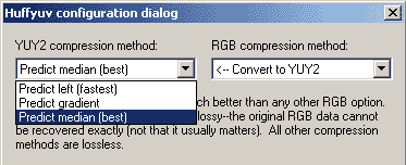 Este códec es realmente sencillo y efectivo, de gran calidad y una buena compresión. Ofrece dos tipos de compresión, sin pérdida (RGB) o con una mínima pérdida de color (YUV2) (Ver 1.2.2 Formatos YUV más comunes) En cada uno de los apartados tenemos tres opciones."Best" ofrece la mejor compresión y. "Fast" una compresión más rápida para equipos menos potentes. La opción restante se queda a medio camino entre rapidez y compresión. Para poder usar la compresión YUV2 deberemos seleccionar "Convert to YUV2" (convertir a YUV2) en el menú RGB
