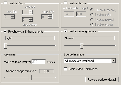 - Psychovisual Enhancements (mejoras psicovisuales): Este tipo de mejora en la compresión está todavía en fase experimental. Del mismo modo que la compresión YUV está basada en la característica de la visión humana que es más sensible a la luminosidad que al color, actualmente se está comprobando que también "apreciamos" más unas determinadas características de las imágenes en movimiento que otras. Activando esta opción daremos prioridad a aquellas partes dentro de una secuencia (no sólo imágenes individuales) que tendrán más importancia para la vista. Estas mejoras, como digo, todavía están en fase de desarrollo. Puedes hacer pruebas por tí mismo para ver si notas la diferencia...