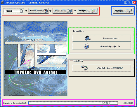 Rojo: Muestra los pasos que hay que seguir para realizar la autoría del DVD. El primero es Start (Inicio) y muestra la pantalla de la imagen previa.
