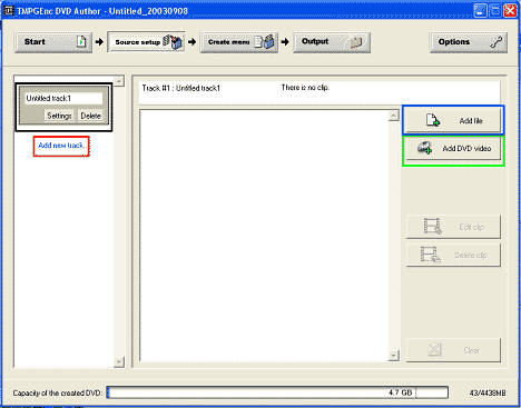 Rosa: El rectángulo muestra la capacidad total del DVD virgen (4.7 GB en lenguaje decimal) y, en color azul, de relleno, lo que van a ocupar los archivos que se van insertando así como los que se van a crear (menús, animaciones, músicas y demás). En el caso de que se superen los 4.7 GB, la barra azul pasará a ser roja. Esta barra se muestra durante las diferentes partes del proceso de autoría. A la derecha del rectángulo se muestra en MB (reales) lo ocupado por el proyecto y el total que puede ocupar(43/4438).