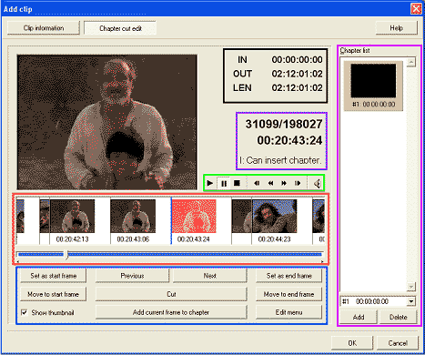 Morado: muestra la posición del cursor en frames y en segundos (ver recuadro rojo). En el ejemplo, el cursor está en el frame 31099 de 198027 y es el punto 20 minutos, 43 segundos, 24 frames. I: Can insert chapter significa que el punto en el que se encuentra es un fotograma I y por tanto, válido para servir de referencia.
