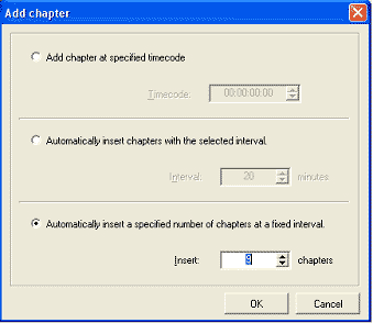 Automatically insert a specified numbers of chapters at a fixed interval (Añadir un número defindo de capítulos automáticamente con intervalos fijos): Inserta un número definido de capítulos. Aconsejo usar esta opción y en múltiplos de 3 porque luego, si se usan imágenes en miniatura para el menú de los capítulos, quedará alguna imagen coja. No es vital, pero le da vistosidad y simetría.