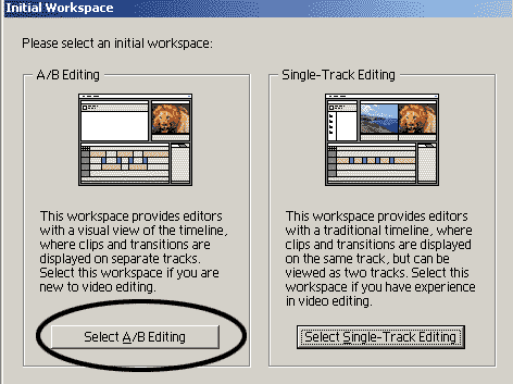 La primera vez que usamos Premiere tras el proceso de instalación, aparece una pantalla preguntándonos cómo queremos trabajar. Si estás usando este manual es porque no tienes mucha idea de Premiere, así que te recomendaría usar el método A/B, puesto que es más "intuitivo". Aunque esta pantalla aparecerá tan sólo la primera vez que iniciemos Premiere, si quisiéramos, en un futuro puede cambiarse (Ver 3.2.1 Las pistas de vídeo), de modo que pinchamos en el botón marcado en la imágen (Select A/B Editing - Seleccionar edición A/B) y pasamos al siguiente paso.