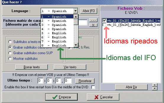 Vamos a "Fichero -> Abrir VOB(s)" o pinchamos directamente en el icono que pone VOB y a continuación en "Abrir IFO". Aunque podríamos abrir directamente un archivo VOB, si necesidad del IFO, recomiendo extraer y abrir el IFO. Una vez seleccionado aparecerá a la derecha una lista con todos los subtítlulos que hemos ripeado con Smart Ripper. Arriba, al lado del botón "Abrir IFO" aparecerá otro idioma. ¿Qué diferencia hay? A la derecha tenemos los idiomas que tenemos ripeados y que, por tanto, podemos usar. Arriba, al lado del botón, por su parte, aparece la información de idiomas del IFO, de modo que habrá que tener cuidado a la hora de elegir idioma arriba, puesto que si seleccionamos un idioma. presente en el IFO pero del cuál no tenemos VOB, no conseguiremos nada.