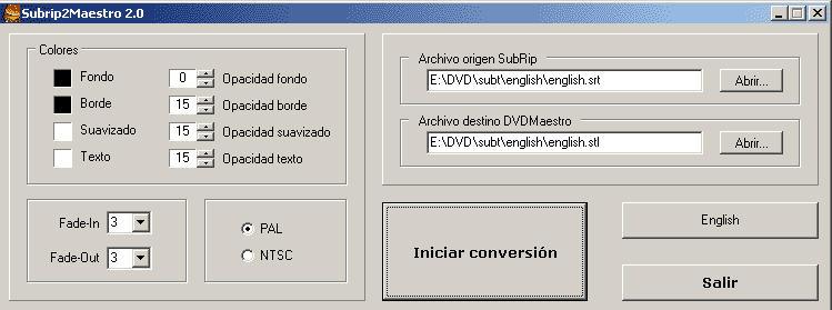 Iniciamos la aplicación y, aunque tal y cómo viene ajustada los subtítulos se verán correctamente, prefiero cambiar el borde a negro y el suavizado a blanco y dejarlo todo al 15 de opacidad, excepto al fondo que, necesariamente, ha de ir a 0 (no importa el color) Basta con elegir el archivo de origen (el que acabamos de crear con subrip) y el de destino (el que importaremos en DVDMaestro) y le damos a iniciar convesión. Antes de terminar de pinchar ha terminado. "Parece" que no ha hecho nada, pero tranquilos, que todo está bien.