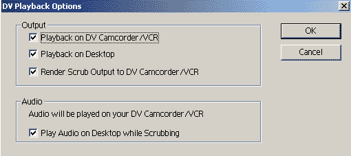 Render Scrub output to DV camcorder /VCR (Ver el resultado de los renders en la cámara DV/VCR):  Con esta opción mientras el ordenador hace el render de algo, por ejemplo,de  una transición, un filtro, etc, etc podrás ir viendo el resultado en el televisor o en la pantalla de la videocámara.