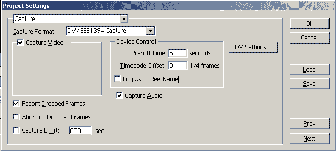 Más arriba, cuando vimos cómo ajustar las propiedades de nuestro proyecto nos dejamos pendiente el apartado de captura. Ha llegado la hora de ajustarlo. Puesto que no tenemos ningún dispositivo de captura definido, si iniciáramos la captura por primera vez, Adobe Premiere abriría automáticamente una ventana de configuración. No obstante, iremos paso a paso a esa ventana antes de intentar capturar. Antes de tocar otra cosa, nos limitaremos a ir al menú "Project" (proyecto) y luego a la opción "Project Settings -> Capture"  (ajustes del proyecto -> Captura) Aquí aparecerán distintas opciones dependiendo de nuestro sistema. En nuestro caso, para capturar desde DV deberemos seleccionar "DV IEEE 1394 Capture" en el apartado Device. Si todavía no tenemos conectada la cámara, o si no está encendida aparecerá "Unable to connect to capture driver" (Conexión con el controlador de captura fallida) Es hora de conectar nuestra videocámara.