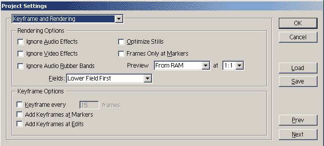 • Optimize Stills (optimizar imágenes fijas) Si incluímos una imágen que permanecerá congelada unos segundos, podemos indicarle a Premiere que, en lugar de calcular la misma imágen cuadro a cuadro, lo haga solamente una vez para todos los cuadros en los que aparezca esa misma imágen de forma continuada. Ésta opción es especialmente recomendable al hacer montajes fotográficos.