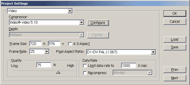• Quality & Data Rate (Calidad y flujo de datos) Con algunos códecs (compresores ) se activan estas opciones. Si marcamos "Limit data rate" (limitar flujo de datos) limitamos el flujo de datos a la cantidad que le indiquemos. Si marcamos "Recompress Always" las partes del vídeo que superen ese límite, serán recomprimidas hasta no sobrepasar ese límite. En mi opinión, estas opciones no son muy últiles en nuestro proyecto puesto que buscamos rapidez y no perder el tiempo con compresiones y recompresiones.