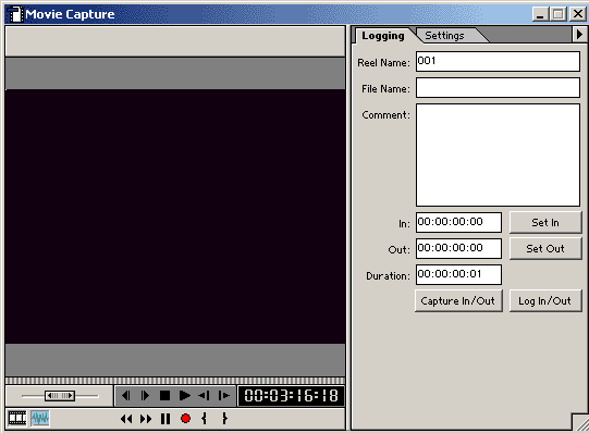 Ésta será la opción que utilicemos para capturar vídeo. Puesto que nosotros ya hemos definido las preferencias y propiedades del proyecto, (ver Ajustando las propiedades de captura del proyectoAjustando las preferencias de captura) aparecerá directamente la siguiente pantalla. En realidad aparecerá seleccionada la pestaña "Settings" (ajustes) pero como digo, ya tenemos definidas las preferencias y propiedades de la captura, de modo que pincharemos en la pestaña "Loggin" y pasaremos directamente "a la acción"