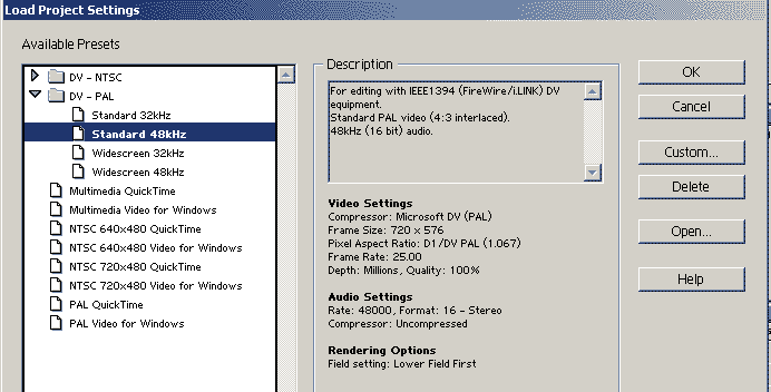 Si vas a trabajar con una cámara miniDV la mejor opción será, sin duda, que selecciones un  proyecto DV acorde con tu formato de trabajo. PAL para Europa, NTSC América y Japón, Stándar para 4:3, WideScreen (panorámico) para 16:9. Los números 32 kHz y 48 kHz indican la frecuencia del audio. CONSEJO tanto para grabar con tu videocámara, como para usar Premiere, usa siempre 48 kHz. Si el formato final va a ser DVD, no hará falta cambiar de frecuencia de muestreo y si el destino es VCD / SVCD o derivados, la frecuencia será 44.1 kHz. En cualquier caso, seleccionar 32 kHz supondría tener que aumentar luego la frecuencia final, lo que normalmente empeora la calidad del audio y puede provocar desajuste en la sincronización. El proceso inverso, sin embargo (pasar de 48 a 44.1 kHz), se realiza más comodamente y con mejores resultados.