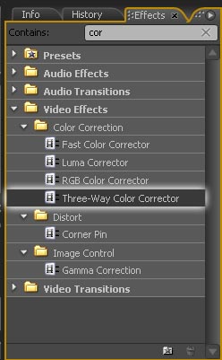 seleccionamos el efecto/filtro: Correccion de Color Tridimensional (Three-Way Color Corrector):