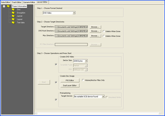 -Directorios: Debemos especificar las carpetas donde Scenarist escribirá los archivos de nuestro proyecto (la imagen del disco, los archivos del DVD y los archivos multiplexados).