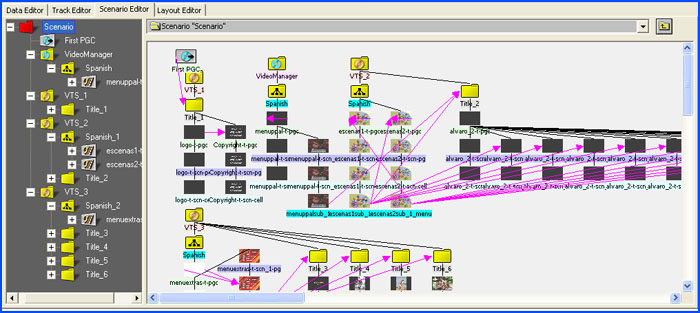 - Ventana de editores: Hay 4 editores en Scenarist, el Data Editor donde importamos los distintos assets que compondrán nuestro proyecto, el Track Editor, donde montaremos los tracks a partir de los assets importados en el Data Editor, el Scenario Editor donde colocaremos nuestros tracks y configuraremos la navegación entre ellos y el Layout Editor, donde generaremos los archivos de nuestro disco DVD, podremos aplicar distintos sistemas de protección y los grabaremos en nuestra grabadora.