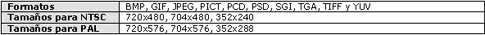 Scenarist admite los siguientes formatos y tamaños de imagen (extraído de la ayuda del programa):