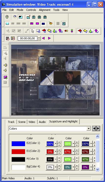 * Añadir la subpicture: Una subpicture es una imagen realizada en 4 colores (blanco para fondo, rojo puro, azul puro y negro puro por defecto), que se superpondrá al menú y que contiene los botones de dicho menú. Para añadirla solo tenemos que arrastrar el archivo desde el explorador de windows al track que funcionará como menú. Automáticamente Scenarist importa el archivo como Subpicture with torced start.