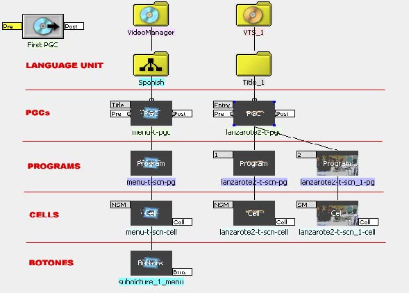 Para que el disco pueda reproducirse debemos específicar cuál será el primer PGC en reproducirse, conectando el Pre del First Play con el Pre del PGC en cuestión.