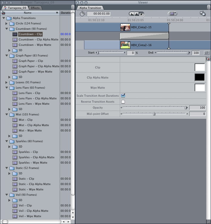 Cada transición consta de tres clips: Clip, Alpha Matte y Wipe Matte que definirán cada una de las funciones, a saber, imagen superpuesta, canal Alpha (el que define lo transparente y opaco) y transición propiamente dicha. Todas las transiciones aportadas por Apple son bastante interesantes y, además, se puede experimentar combinando e intercambiando los clips. Esta nueva función también deja la puerta abierta a que empresas externas creen repositorios de pago con transiciones predefinidas, lo que siempre es interesante para lograr resultados profesionales con poco esfuerzo. Paticularmente, de las incluidas por Apple mis favoritas son "Static", que simula el ruido estático de una televisión analógica sin sintonizar, y Veil, que es como un suave velo.