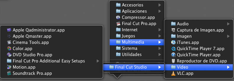 2. Las aplicaciones Final Cut Pro y Compressor deben estar en su ubicación por defecto, es decir, en la carpeta raiz "Aplicaciones". Sí... ya sé que el 99% de los usuarios no modifica la carpeta "Aplicaciones" pero yo, que soy un maniatico del orden, me gusta hacer muchas subcarpetas para clasificar las decenas de aplicaciones que suelo tener instaladas en mi equipo. Las aplicaciones de Final Cut Studio las tengo en "Aplicaciones -> Multimedia -> Video -> Final Cut Studio" Todas funcionan correctamente de forma independiente pero, si quiero exportar desde Final Cut Pro a Compressor cuando estas dos aplicaciones no están en su carpeta por defecto aparece un error.