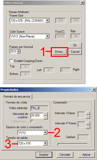 NOTA: Si tu tarjeta capturadora posee el chip Brooktree/Conexant BT8x8 (la mayoría de tajetas sintonizadoras de TV de 60-100€, mira la documentación de tu tarjeta) deberás usar YUV2 puesto que dicho chip tan sólo procesa el vídeo como YUV2 y cualquier otro formato, incluído el RGB24, se consigue partiendo de un original YUV2, o sea comprimido. Mira la sección 3. Capturadoras con chips Brooktree/Conexant BT8x8