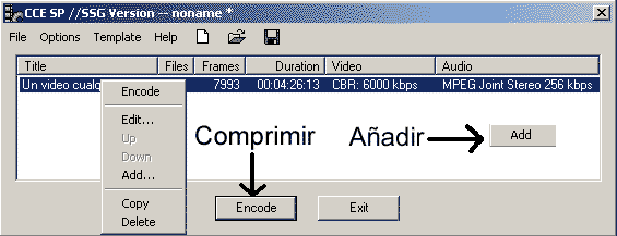 - En ROJO: A la izquierda la duración del vídeo y los fps. Al a derecha el tamaño del CD. Debajo, el compresor que usaremos, en este caso TMPGEnc para crear un SVCD (siempre que usemos MPEG-2 estaremos creando un SVCD)