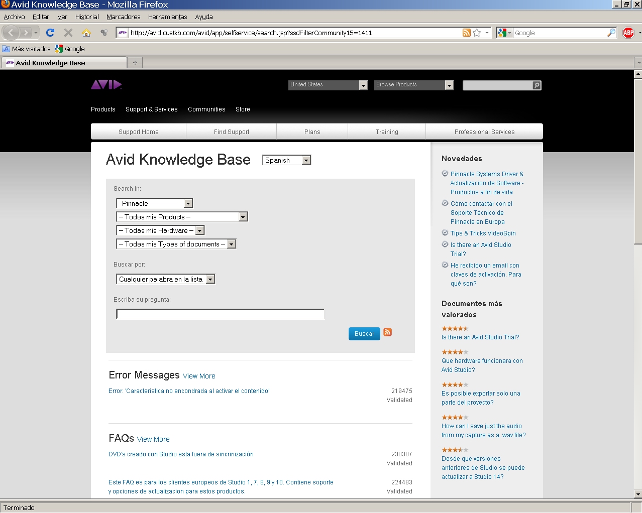 Si además hemos seleccionado la otra casilla de "Ver soluciones para la Instalación de complementos adquiridos, Problemas de instalación o Problemas al iniciar el programa" y teniendo disponible la conexión de internet, accederemos a la Base de conocimientos de Avid (Avid Knowledge Base) en donde podemos localizar en sus FAQs (Frequently Asked Questions o Preguntas Frecuentes) y Foros la respuestas adecuadas.