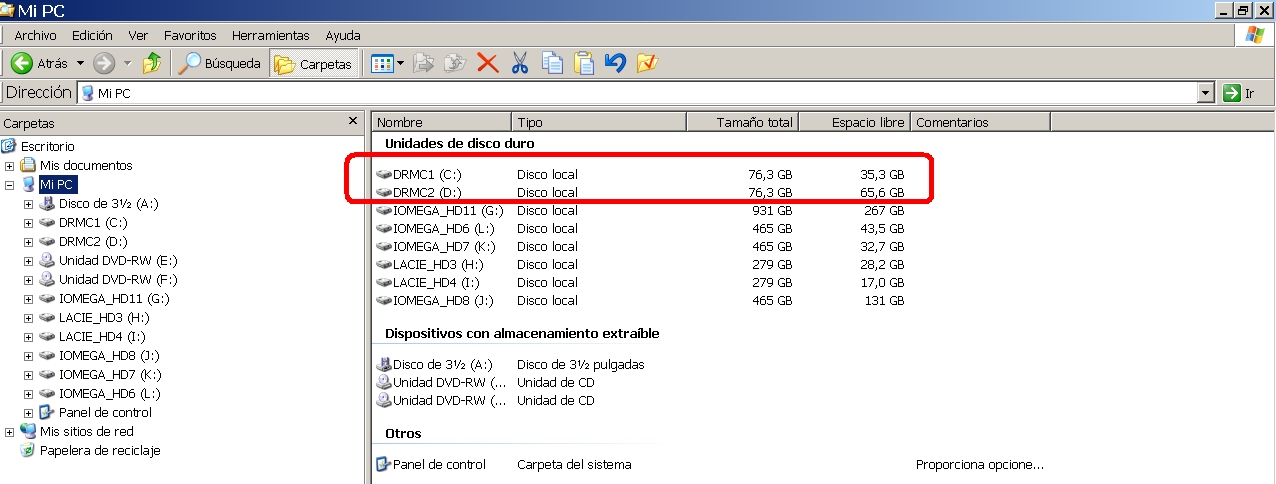 Almacenamiento con 2 HD Maxtor de 80 GB c/u Ultra-ATA/133 a 7.200 rpm